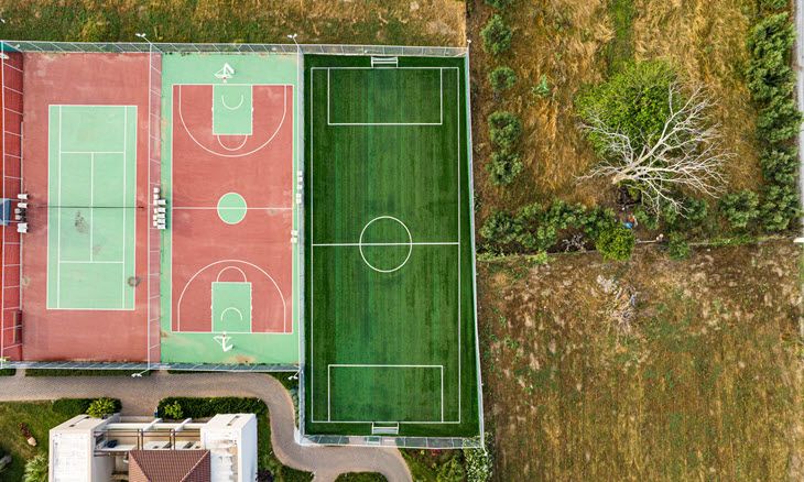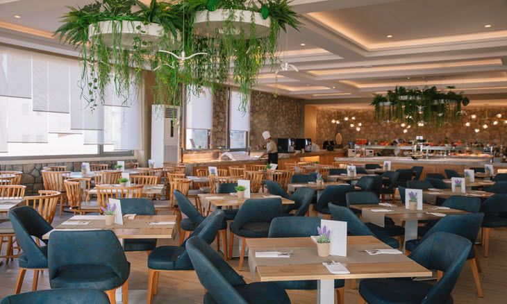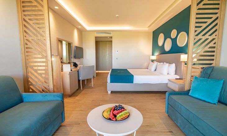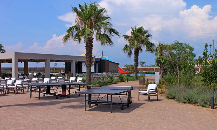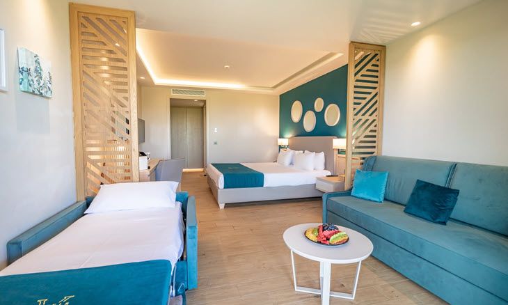 Almyros Beach Hotel offers daytime entertainment to all guests: from morning gym and Pilates to water gymnastics and dance lessons. The evening entertainment includes music night shows, karaoke, and themed nights. Kids will have the best of time at the playground and the mini club, which is full of activities (face painting, handcraft, pool games and many more) so they can keep busy while adults indulge having a drink at the pool bar or laying in the sunbeds in the pool area. Moreover, the outdoor pool features three water slides. In the evenings nothing better than some entertainment before going to bed. For those looking for some activity the hotel features two tennis courts, a 5×5 football court as well as a basketball/volleyball court.