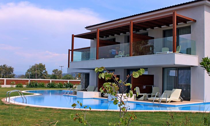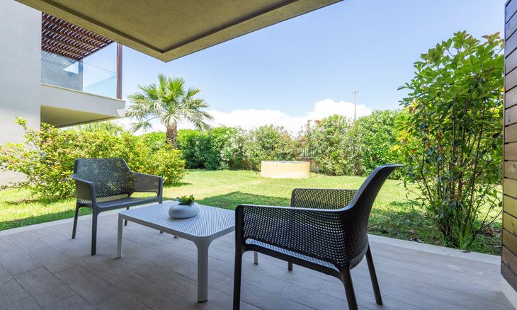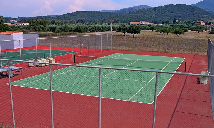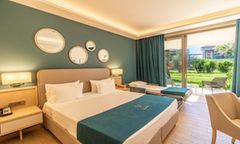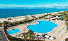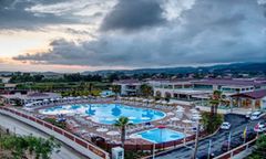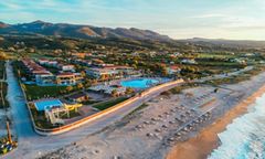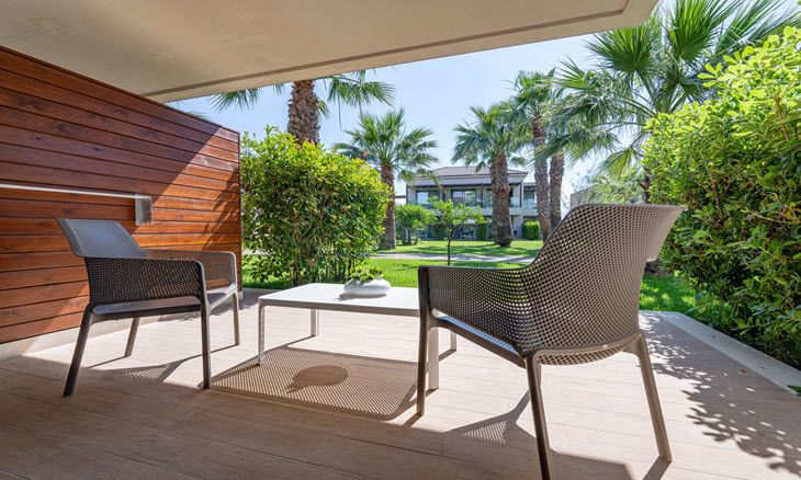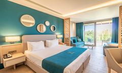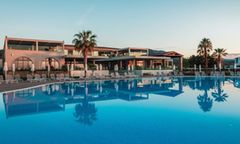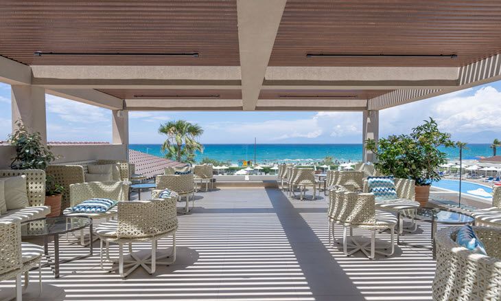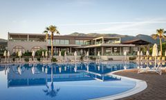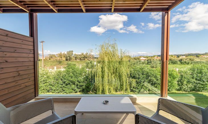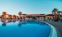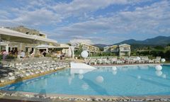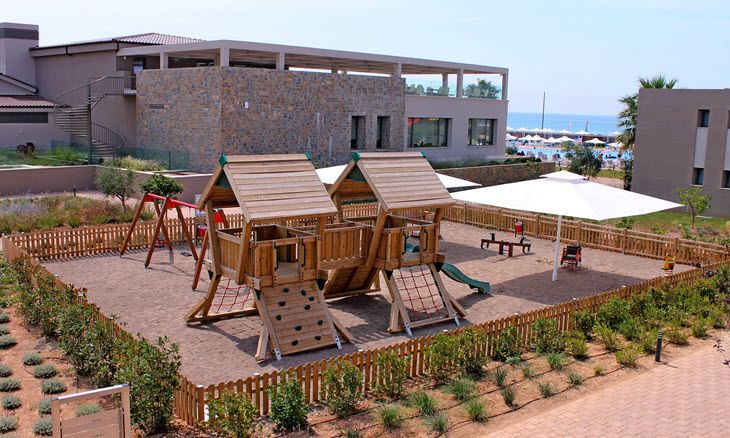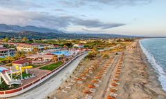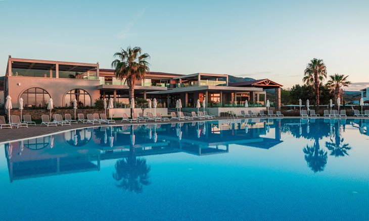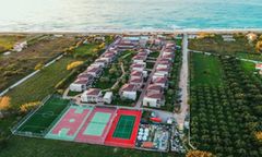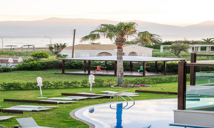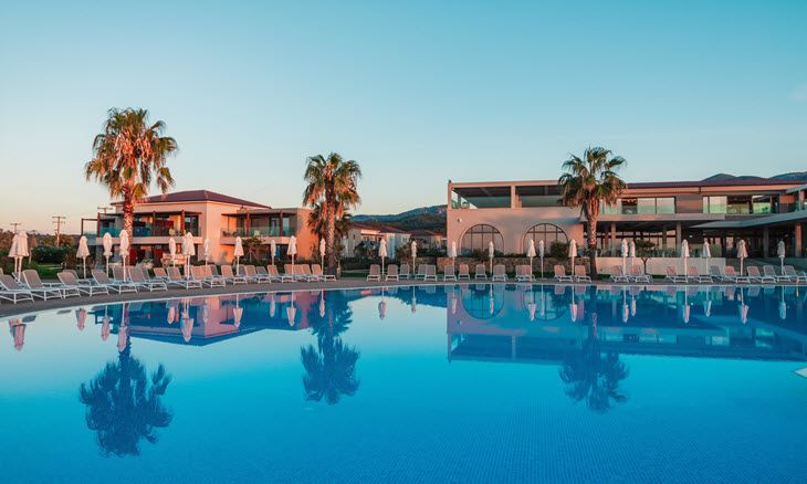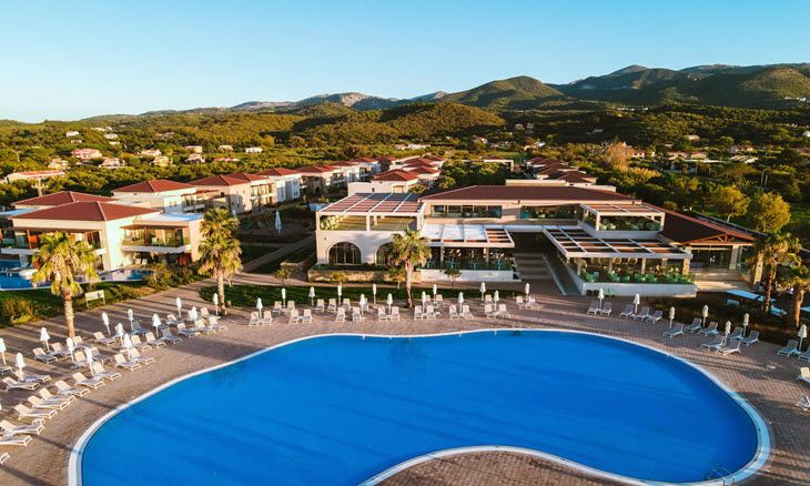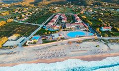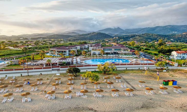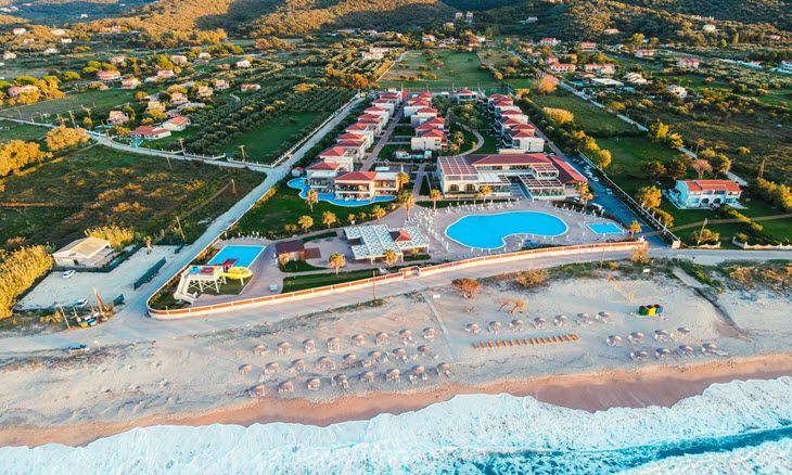 Built on a flat coast, the Hotel Complex touches the golden sand beach and the turquoise waters of the Ionian Sea, while it is surrounded by green fields and wooded hills. The Hotel includes a central building and many bungalow complexes. In the central building, one finds the reception, the restaurant, the lounge, the main bar and its cafeteria, meeting rooms, a multipurpose space, games, the kids club etc. The bungalow complexes have rooms at the ground floor and the first floor.