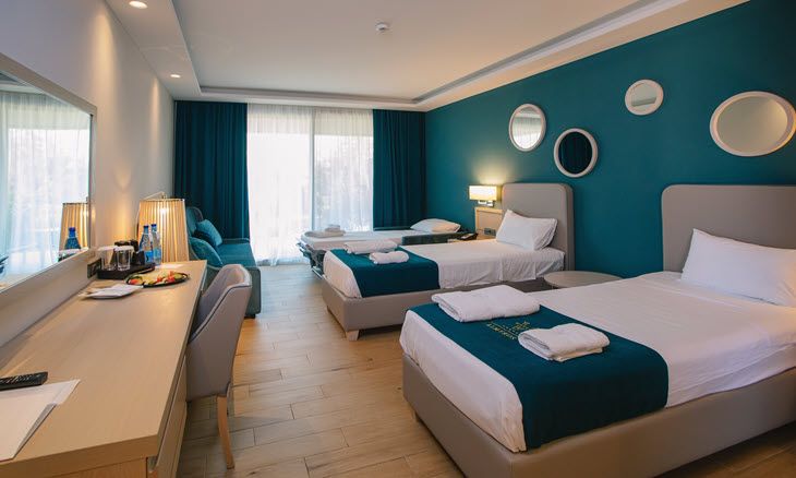 In addition, two restaurants, three bars, three swimming pools,waterslides, multiple sports facilities, all-day recreational activities and a Spa center are provided on site.