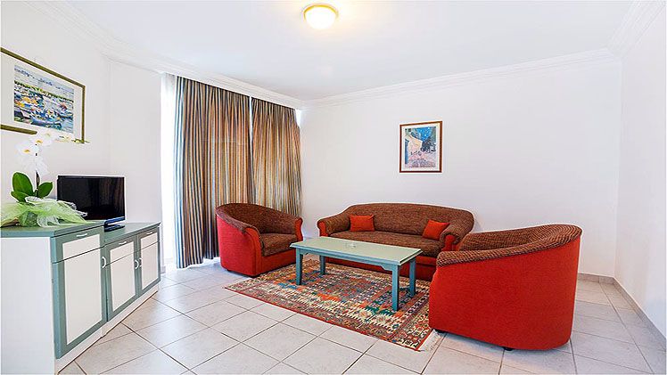 This family friendly apartment hotel comprises a total of 60 luxury apartments with a capacity of 280 beds. For a relaxed holiday, guests have the choice of a 1-bedroom apartment and for larger families a 2-bedroom apartment. Facilities on offer to guests include a lobby area with a 24-hour reception, a hotel safe, a currency exchange facility, lift access and a café. It also offers a bar, a TV lounge and a restaurant. Guests may take advantage of the laundry, ironing and dry cleaning services, provided by the ladies from the housekeeping staff.