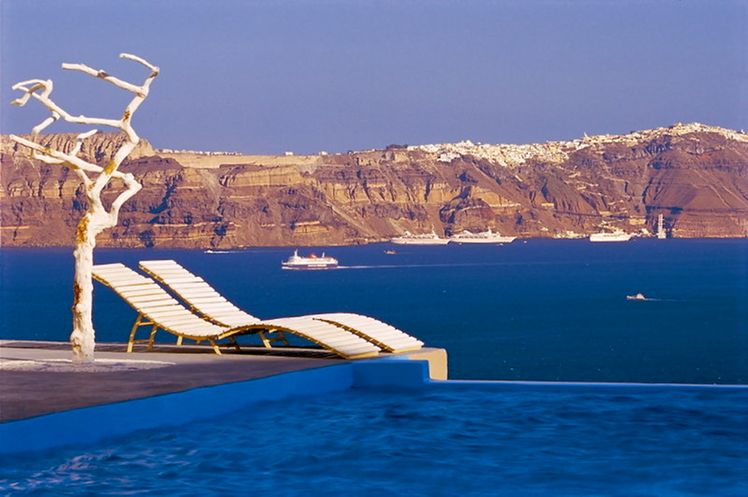 Leisure and cultural options abound nearby, such as in Akrotiri, an ancient city buried and preserved by volcanic ash—known as the Pompeii of the Greek islands—and at Red Beach and White Beach, the ultimate locales for a spectacular day of fun in the sun. For the most private and romantic sunset views, the lighthouse (Pharos) of Akrotiri is the best choice.