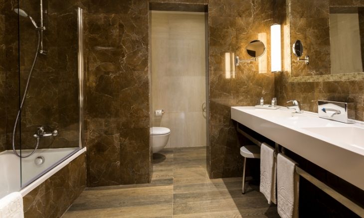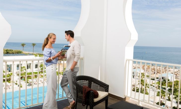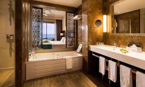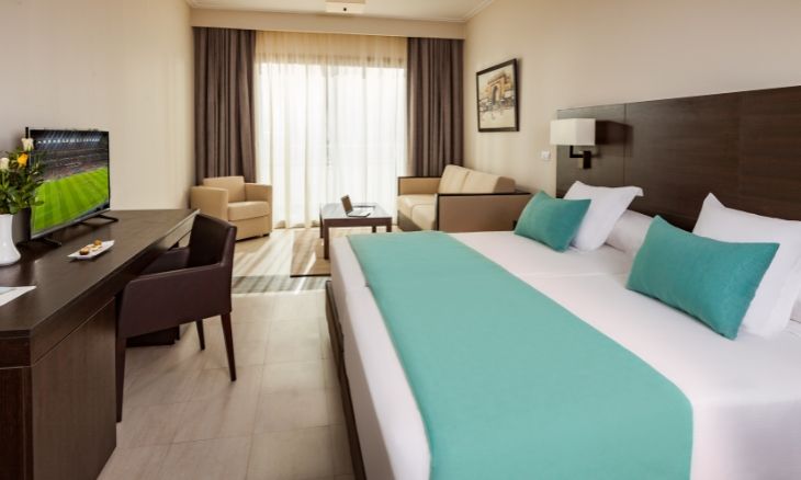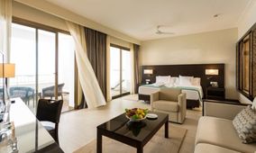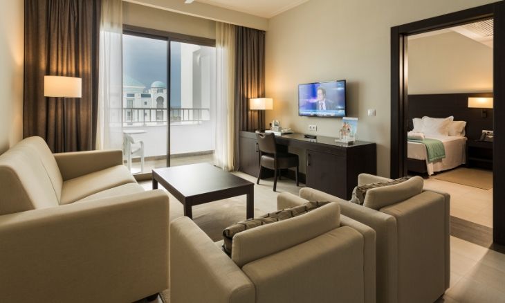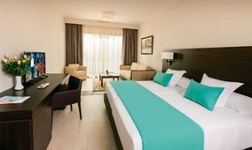 Accommodation ranges from Classic Sea View Doubles and Garden View rooms (each 46 m²) to spacious Junior Suites (65–75 m²) and Premium Suites (60–65 m² with a 17–20 m² terrace). Family Rooms (65–75 m²) offer separate living areas and terraces overlooking the gardens or sea, ensuring a comfortable stay for travellers of all ages. Each room features modern furnishings, generous storage and well-appointed bathrooms with double washbasins and both bath and shower facilities.