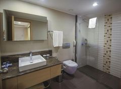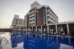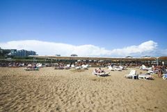 This modern resort hotel is situated just steps from the beach and 20 minutes’ drive from the popular seaside resort town of Side. Guests might wish to visit Side’s stunning historical attractions such as the Temple of Apollo or the city walls, or simply spend lazy days sunning at the beach or on the stylish wooden deck by the hotel’s large outdoor pool. Children will delight in the three waterslides, paddling pool and children’s playground, and adults can relax in the Turkish bath and sauna in the spa.