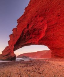 The best time to visit Legzira beach is at sunset, when the arch turns a vibrant shade of red as the light settles. Thought to be a thousand years old, the arch is surrounded by equally as striking rocky cliffs, cosily framing the beach.