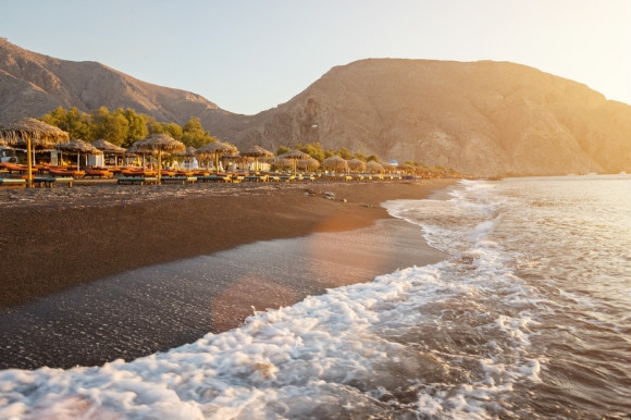 The black sand beach of Perissa during sunrise in Santorini, Greece