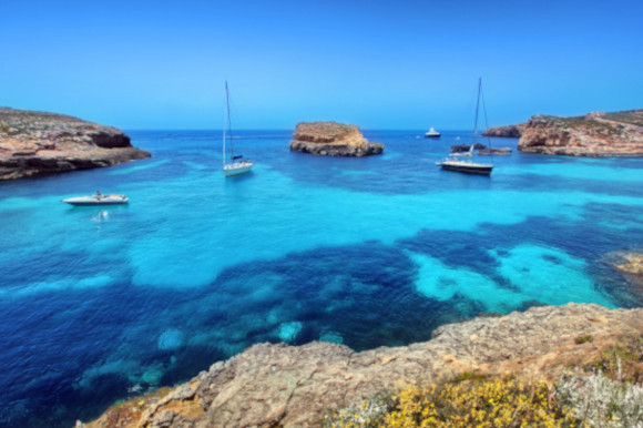 The Blue Lagoon and its yacht-filled waters and azure waters on the island of Comino Malta