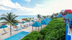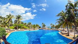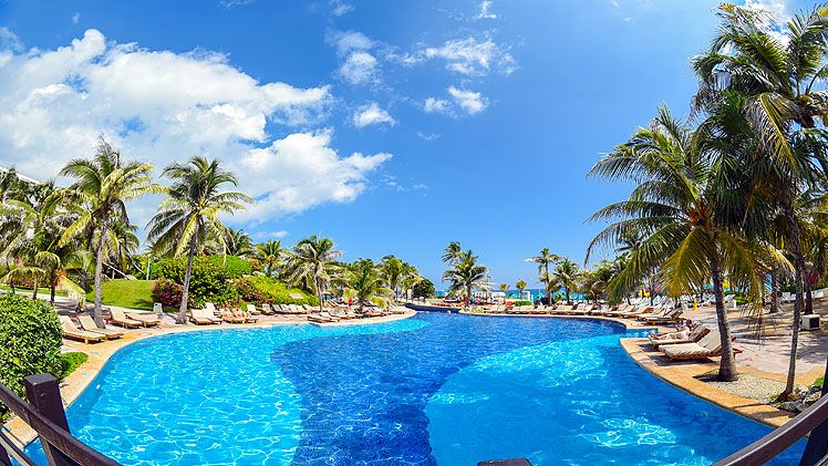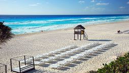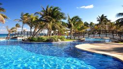 The Grand Oasis Cancun Hotel is set amidst tropical landscaped gardens bordering a lovely white sand private beach 1/2 mile wide on the idyllic Cancun Hotel Zone. Perfect for couples and families with plenty of beach space and nearby water sports, this exquisite 5 Star All Inclusive resort boasts first class facilities and accommodation complemented by a friendly service and bright and breezy rooms with stunning views. Guests can enjoy fine dining, relax on the beach or the sparkling swimming pool, get pampered at the on-site SPA, practice your golf swing, and discover countless attractions with bus service just steps from the hotel.