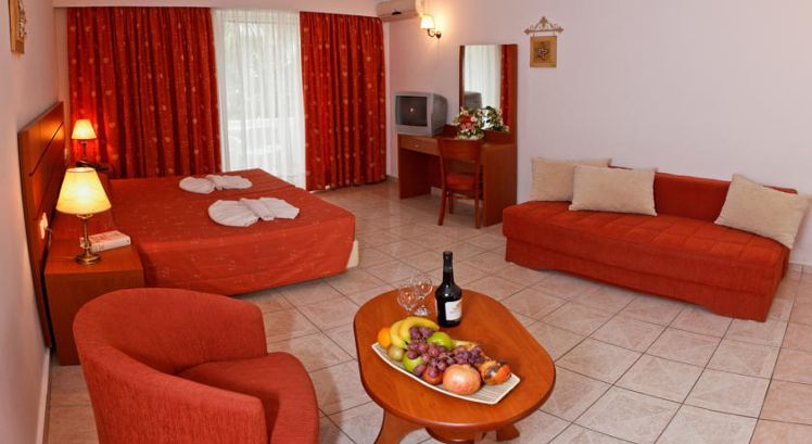 FAMILY ROOM The quatrable rooms are of approximately 23 square meters, have a lovely view to the lush gardens or pool and accommodate up to 4 persons. They have 2 single beds and one double sofa bed. They also have a bathroom with a bathtub.