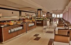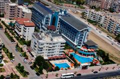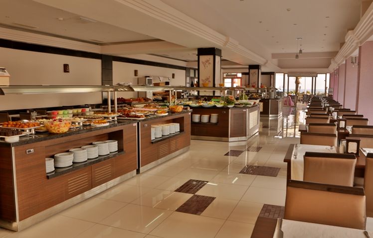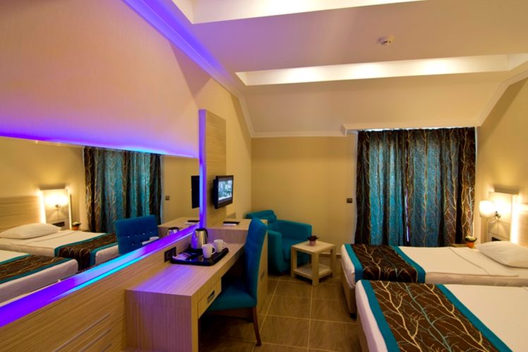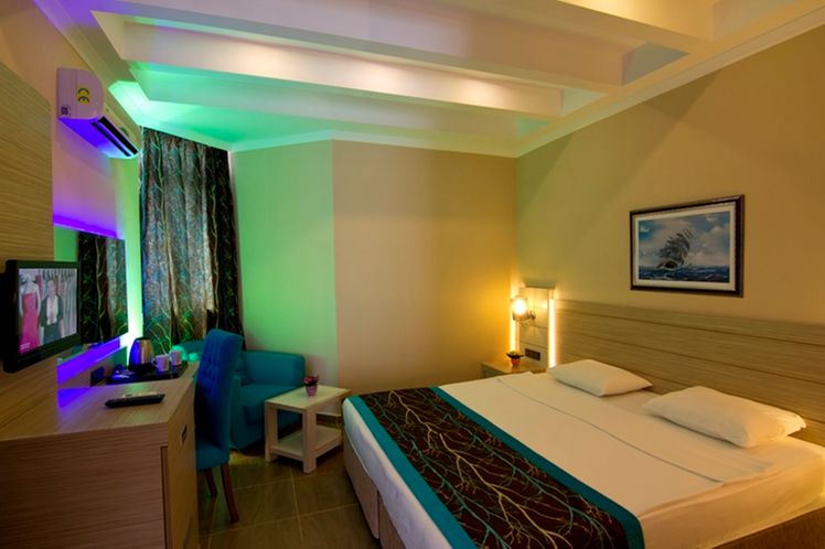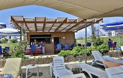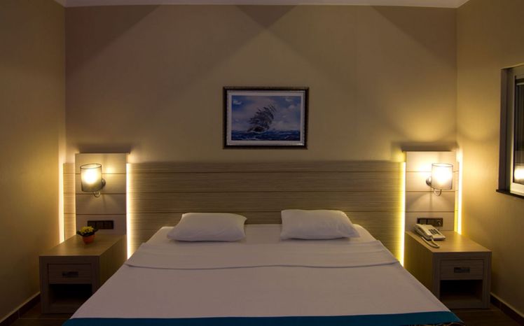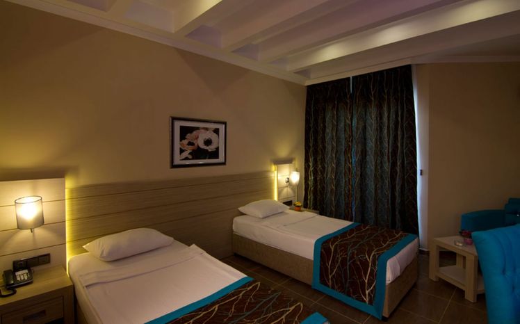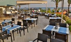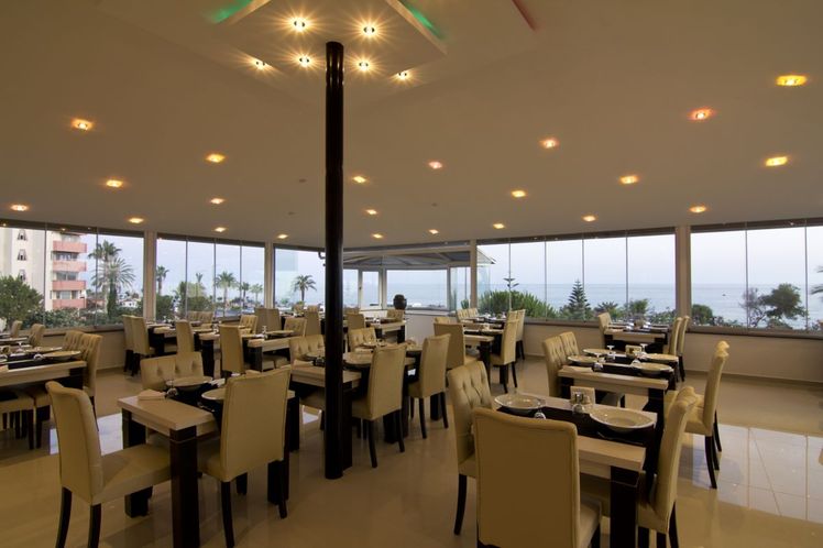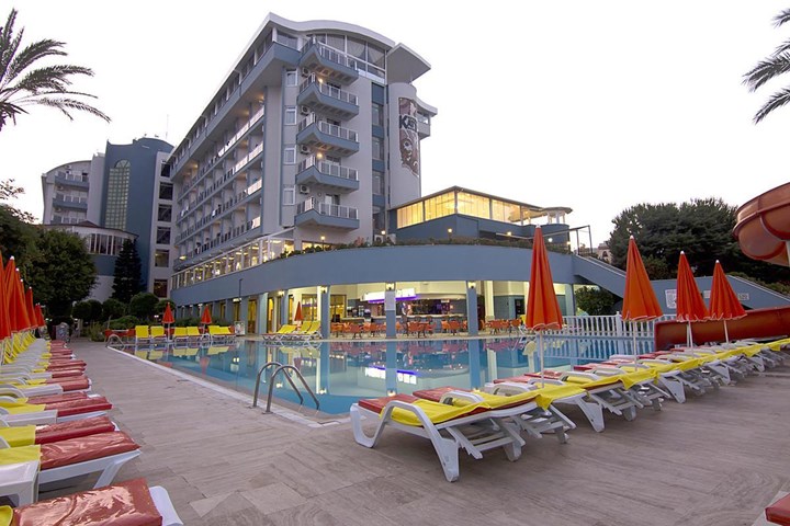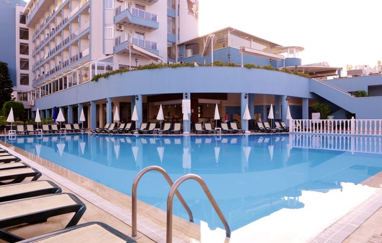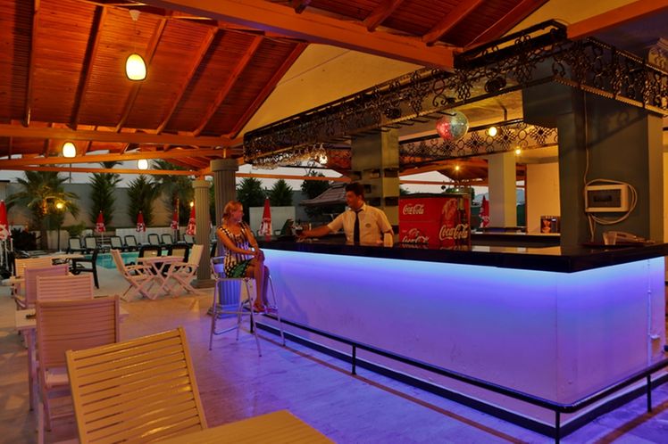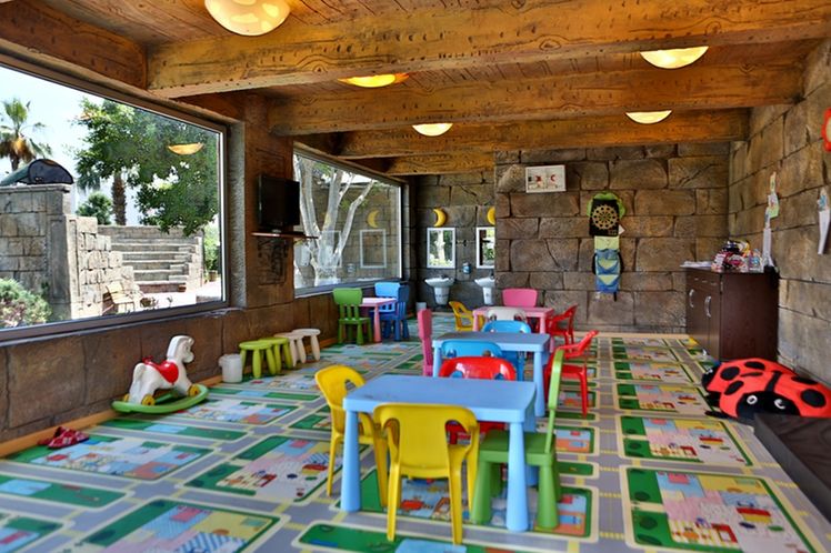 Renovated in 2011, the hotel comprises 275 rooms,3 buildings a foyer, a 24-hour reception, a hotel safe, a bureau de change, a lift, and a cafe. Additionally, the hotel offers a kiosk, a snack shop, diverse shops, a hairdresser, a bar, a disco, a games room, a TV corner, and an air-conditioned a la carte restaurant with outside terrace and sea views (highchairs for children are provided). Furthermore, there is a conference room, a public Internet terminal, laundry and medical services as well as a kids’ club, a play area, a car park and a garage. The hotel also owns its own charming 18,000 m² garden, where guests can bask in the relaxing atmosphere.