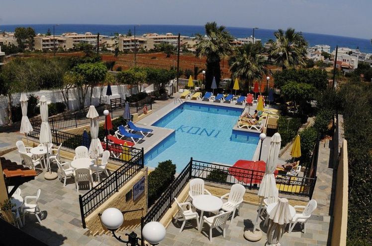 Koni Village is located 800 m from the sandy beach. The closest cities to the hotel are Heraklion (30 km), Malia (2 km) and Chersonissos (6 km). To make your stay more comfortable a mini market, a lobby, air conditioning, a lounge and a reception are available. The staff in this 2 storey hotel speaks French, German and English. A playground for children is available. 2 fresh water swimming pools, seasonally open with a separate children’s pool are available. Refreshing drinks are offered at the pool bar. Sunshades and sunbeds are available for an additional fee at the beach and free of charge at the pool.