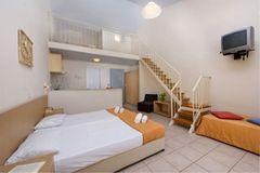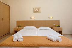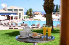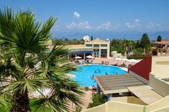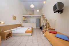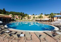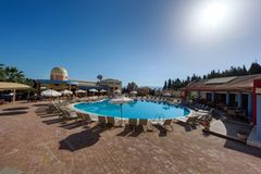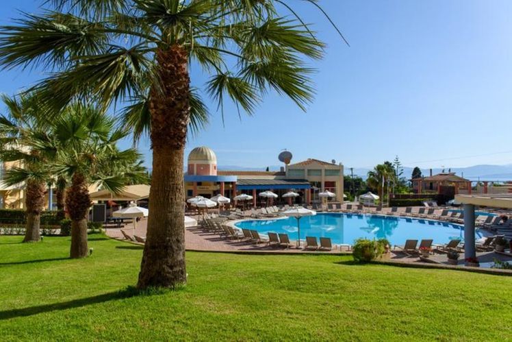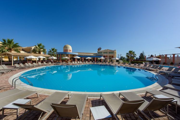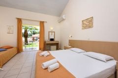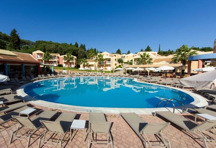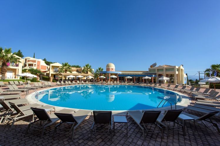 Situated in a side street of the Kavos resort and built on a hill- side from where you have beautiful views. Only a few minutes away from the center of Kavos village with many entertainment venues. To Corfu town is about 40 km, The sandy beach is ca. 500 away. A modern complex set as a small town with a total of 77 units divided over several buildings, there is a reception, games area, restaurant. In the well-kept garden is a large swimming-pool with separate children’s pool and sun terrace, Pool bar. Sunbeds at the pool