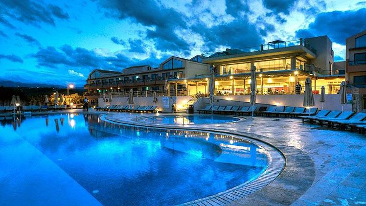 Positioned directly on the shoreline of the Cretan sea, the resort provides immediate access to its Blue Flag sandy beach and sits within easy reach of the village of Kalyves. The hotel grounds include sea-facing terraces and balconies across many rooms and apartments, while the surrounding area offers mountain views from selected accommodation. The resort’s proximity to local transport is practical for guests, with the nearest bus station only a short walk from the property and transfers to and from the island’s airports and ports available on request.