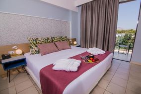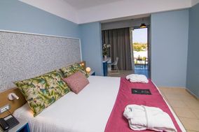 All rooms were refurbished between 2019 and 2020 to reflect a modern, minimalist aesthetic. Each unit includes a shower room with hairdryer, telephone, 42-inch satellite TV, complimentary Wi‑Fi, safe, mini fridge and a balcony or terrace overlooking the gardens or pool areas. Select rooms also provide partial sea views of the Aegean, ensuring a restful environment for every guest.
