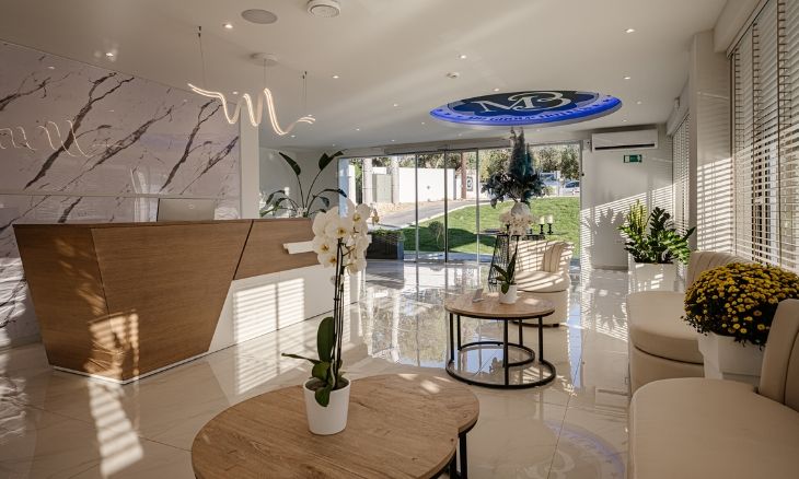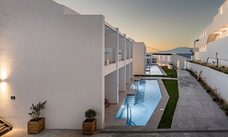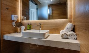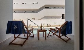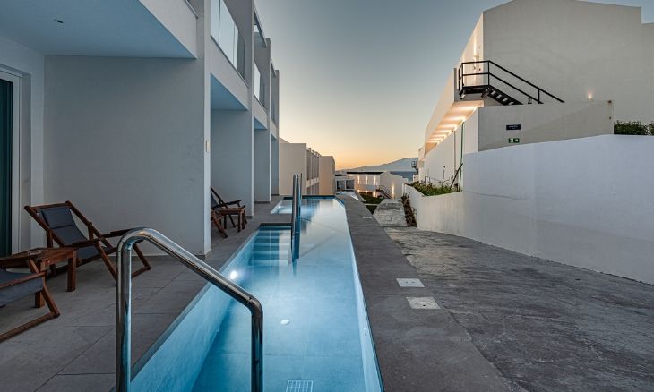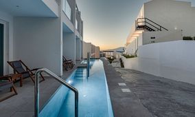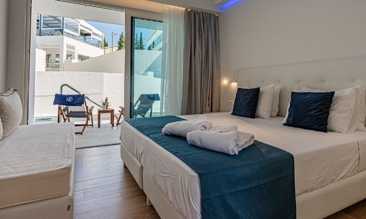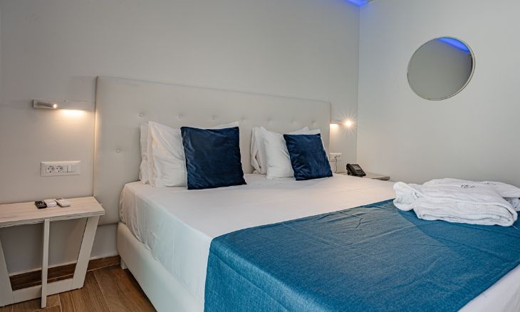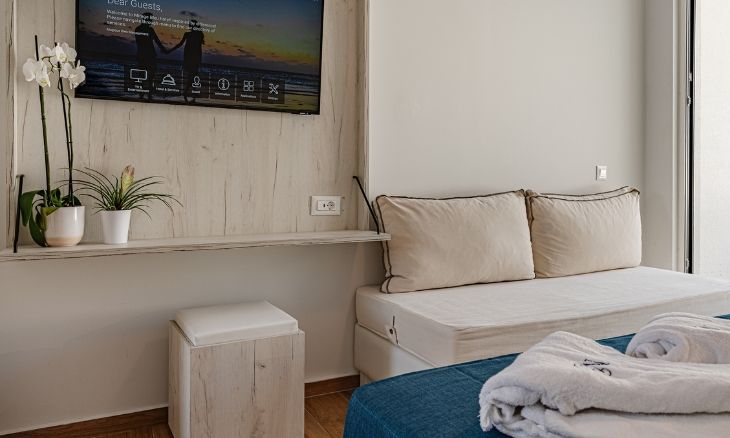 The hotel features 70 modern junior suites, each spanning approximately 24 m² with an open-plan layout. Every room is equipped with individual air conditioning, heating, a 42-inch smart TV with satellite channels, coffee and tea facilities, and a safety deposit box. Guests can choose between suites with a sun deck or direct access to a shared pool, while special amenities are available for celebrations and romantic occasions.