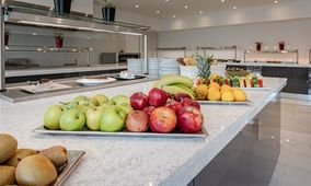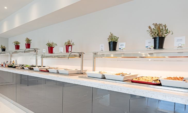 The all inclusive dining experience features a main buffet restaurant with a terrace and live show cooking, serving both Greek and international dishes. The property also offers a poolside bar and a coffee shop with snacks, providing meals from an American buffet breakfast to buffet-style lunches and dinners. Special dietary options and weekly culinary theme evenings ensure that every guest finds something appealing on the menu.
