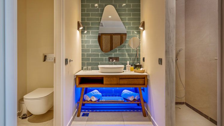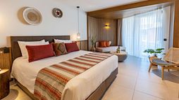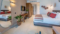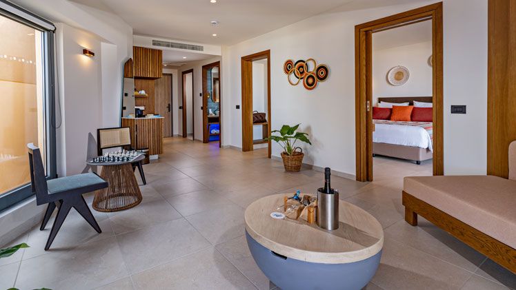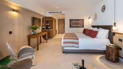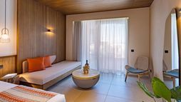 Minos Ambassador suites capture the essence of luxury and comfort combined. Earthy tones, timber furnishings, boho touches and luxury amenities create an atmosphere of ultimate relaxation and premium hospitality. All suites are spacious and filled with natural light, featuring modern bathrooms and private furnished balconies.