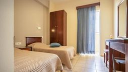 Standard Studios up to 3 persons with Pool View (Approximately 20 square meters) They can accommodate up to three adult persons with three single beds. A shower W.C room, well equipped kitchenette corner with dining table and chairs are the facilities of the studios, not to mention, self catering equipment such as electric cooking rings, kettle, refrigerator, cutlery, crockery and glassware are available. Facilities of hair dryer, safe box*, air-conditioning(cooling-heating)*, tv are available in this room type.