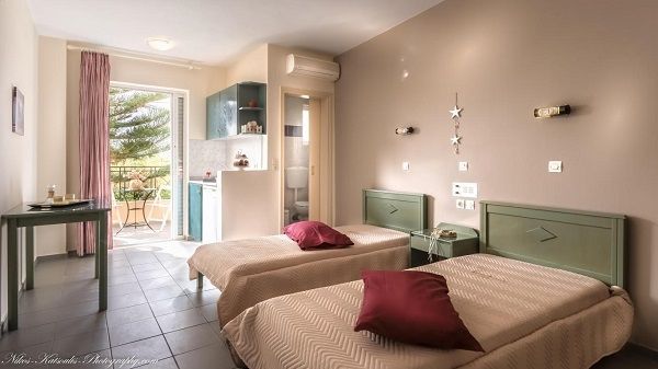 Superior Studios up to 3 persons with Garden View (Approximately 23 square meters) They can accommodate up to three adult persons with one double bed and one single bed. A shower W.C room, well equipped kitchenette corner with dining table and chairs are the facilities of the studios, not to mention, self catering equipment such as electric cooking rings, kettle, refrigerator, cutlery, crockery and glassware are available. Facilities of hair dryer, safe box*, air-conditioning(cooling-heating)*, tv are available in this room type.