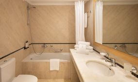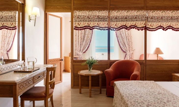 Each bathroom consists of towels, a scale, hairdryer, bathtub, slippers, and premium bath/shower amenities. Upgraded room options include the Studio Sea View, featuring an open plan living space, kitchenette and exquisite sea views, and the Superior Maisonette Sharing Pool, with split-level accommodation and direct access to a shared swimming pool.