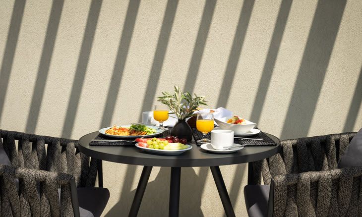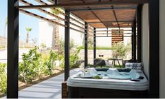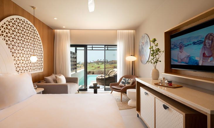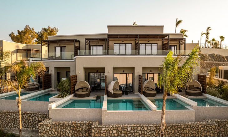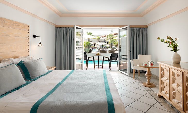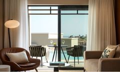 The accommodation at Mitsis Rodos Village ranges from stylish superior rooms to spacious family suites, all featuring modern décor and contemporary comforts. Each room is designed to create a relaxing environment, with options such as sea views, garden views, or private pools available. The suites offer additional space, making them perfect for families, with separate sleeping areas and extra amenities for comfort and convenience. Whether guests choose a room with a private Jacuzzi or a shared pool, they can expect a luxurious experience with high-quality service.