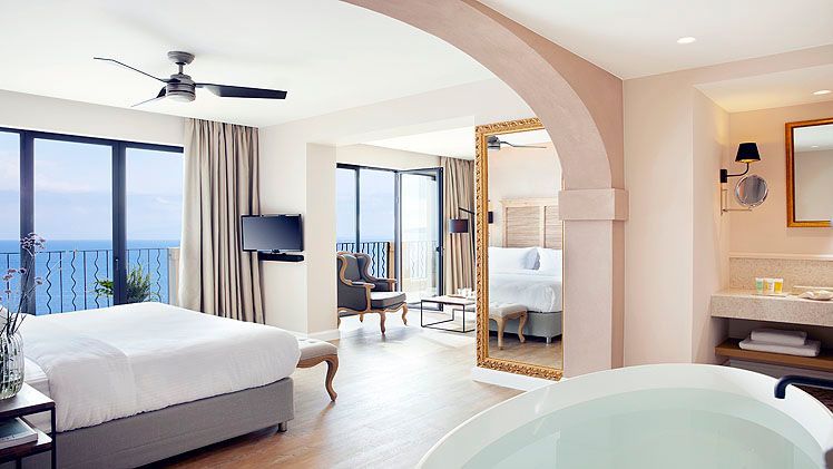 Suites are contemporary in style and designed to maximise sea views, with private terraces fully furnished for outdoor living and many suites offering private pools or whirlpools. Interiors combine lounge areas and refined fittings with practical amenities and in-room dining available via room service. Options range from junior suites with sea views and furnished verandas to larger suites that provide extensive living space and dedicated outdoor areas, all presented to deliver privacy and comfort for adult guests.