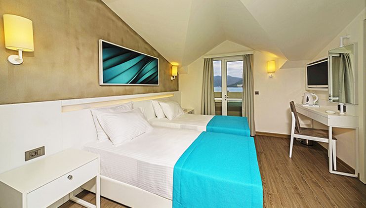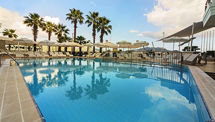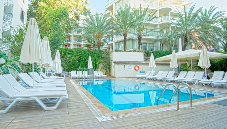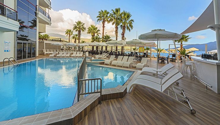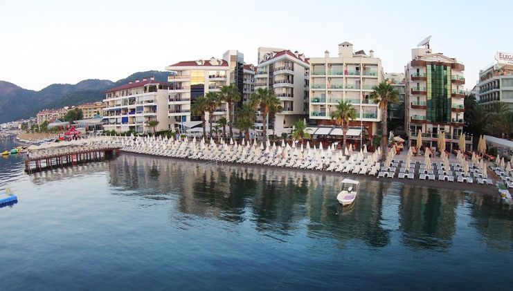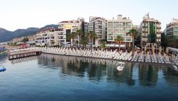This modern, attractive Adults Only hotel is situated right on the coast just a two minute stroll from the center of popular resort town Marmaris. Visitors can take an excursion to Marmaris castle and national park to observe a varied and colorful landscape and sunbathe at quiet, pristine beaches. The park is also the site of two ancient cities, Physkos and Amos, where visitors can see the ruins of an ancient temple, theater and city walls that date back to the Hellenistic age. Alternatively, guests may simply lounge by the shimmering hotel pool and enjoy a snack or a refreshing drink from the pool bar, or luxuriate in a massage in the fitness center complete with sauna and steam room. Rooms are comfortable with air conditioning and private balcony with sea or mountain views, and the hotel restaurant offers delicious international cuisine for breakfast and dinner. The ideal place for fun in the sun where the Aegean meets the Mediterranean.