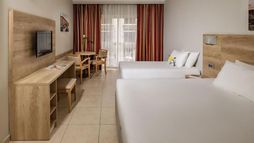 The QAWRA Palace Resort & Spa features 392 rooms over eight floors. Rooms are air-conditioned and heated, all with a balcony, en suite bathroom with walk-in shower or baths (limited amount of the rooms with baths), mini-fridge, hairdryer, telephone, safe deposit boxes (local charge) and Satellite TV. Some rooms have an internal view. Sea view rooms are available at an additional cost.