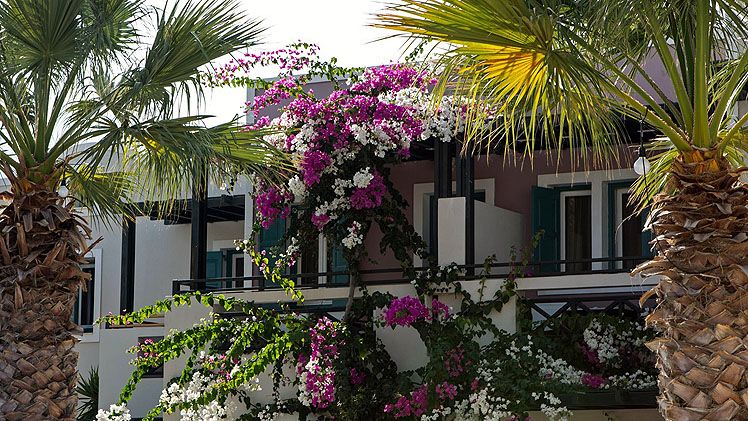 The beach hotel is located in Kamari Village directly on the beach. Kamari is a village with great amounts of tourist activity, with a 2 km-long stretch of beach, lots of hotels, restaurants, bars, coffee shops, clubs and shops on the seafront.