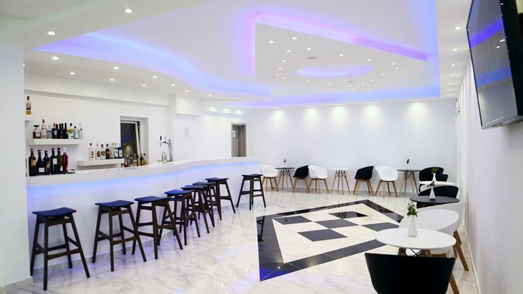 The main restaurant, Orfeas, serves buffet-style meals throughout the day with a varied selection of international and Greek dishes. A smart-casual dress code applies during evening dining. Drinks are available at the Achilleas main bar, offering a range of local spirits, beer, wine, hot beverages and soft drinks as part of the all-inclusive package. The Odysseus pool bar provides refreshments throughout the day, with both alcoholic and non-alcoholic options available. Guests may also explore Saint George village nearby, where shops, supermarkets, and traditional restaurants can be found.