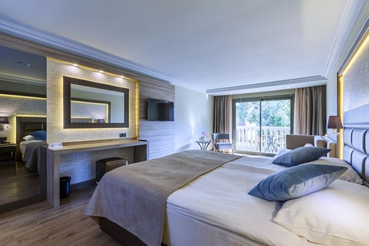 Recently renovated in 2018, the 2-storey beach hotel has 301 rooms. It is equipped with a 24h reception, a lobby with bar, 2 lifts, an air conditioning, a coiffeur, a kiosk, discotheque as well as a money changing facility. For the meals, there are two restaurants (air-conditioned) and a snack bar. In a total 6 bars, you can relax in the evening in good company. WiFi is available for free. Room cleaning is free of charge. Room service, laundry / ironing service and medical service are available for a fee.