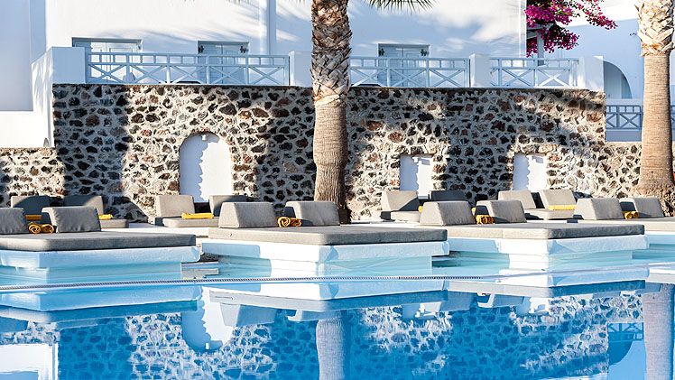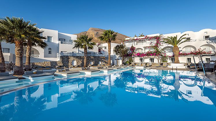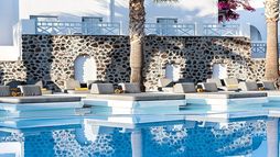 Gracefully lying below the hill of Ancient Thera and a stone’s throw away from the famous Kamari Beach, Santorini Katelli Resort is a peaceful luxury retreat that combines a perfect location with elegant accommodation, top-class facilities and stunning views. The 5-star resort has everything you would ever need, 4 swimming pools, a poolside restaurant and bar, on-site spa, a fitness centre, floodlit tennis court and plenty of room to relax and unwind.