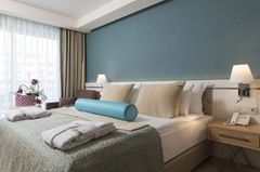 Boasting glamorous blue and white chic interiors, your stay will be nothing short of stylish. There’s a large king-size bed offering the ultimate night’s sleep, while the lengthy mirror which covers the wall is ideal for getting ready. Rooms are air conditioned for pure comfort and there’s also a mini bar, TV and balcony.