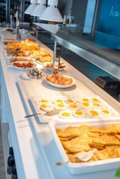 Restaurant for Breakfast – Action:at nearby property (joined services); Comment:Breakfast & Dinner are served at sister hotel Island Beach Resort restaurant; Distance:450
