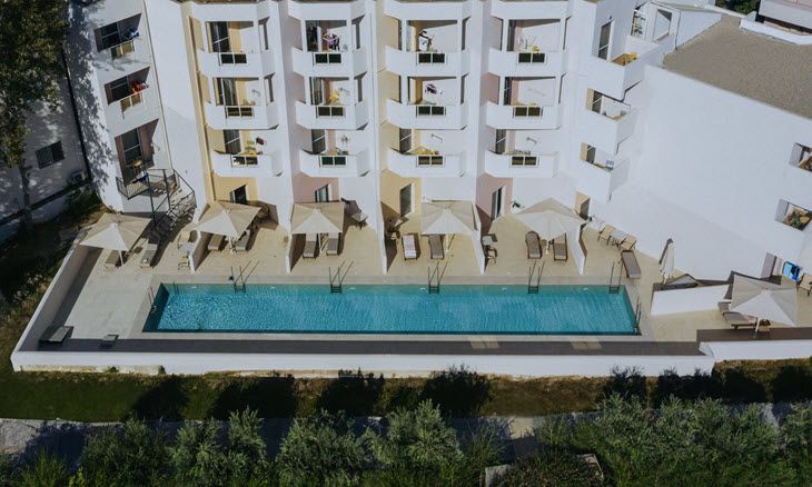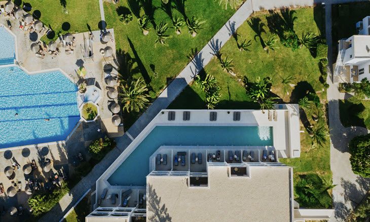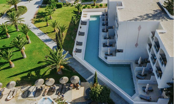 The hotel stands right on the beachfront, conveniently close to the attractions, shops and tavernas of Kardamena village. Guests can walk to local facilities within minutes while remaining in a quieter, garden-framed portion of the coastline. The grounds extend to a private sandy and pebbly beach directly in front of the premises where sun loungers and umbrellas are provided for guests, and a range of water sports is available from the shoreline as a third-party service for an additional charge.