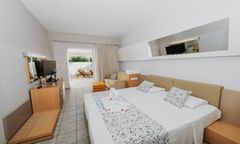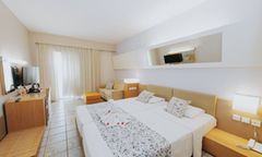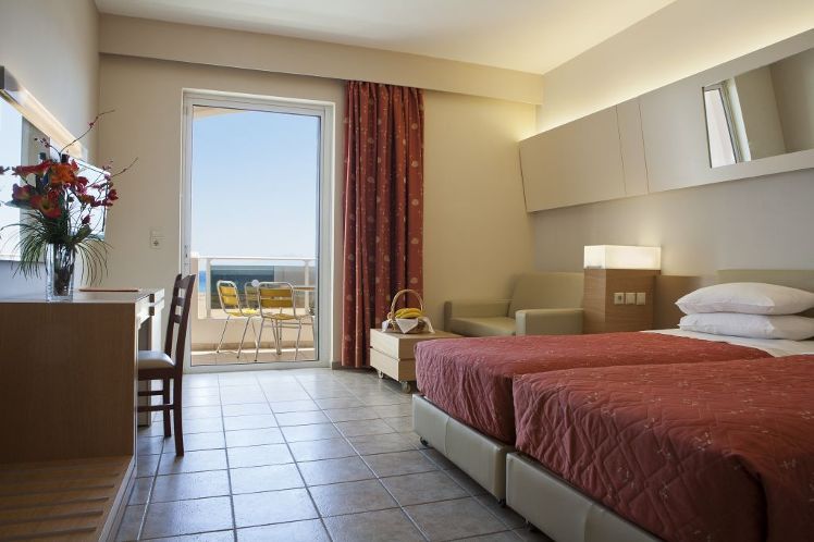 Accommodation ranges from garden-view twin rooms with Jacuzzi to sea-view twin and triple rooms, swim-up rooms and family bungalows. Twin rooms with garden view provide twin beds, a sitting area, dressing desk, bathroom with hydro-massage fittings and a private balcony with Jacuzzi facilities. Sea-view twin and triple rooms feature private balconies overlooking the Aegean, bathrooms with bathtubs, and sitting areas; the triple room comprises two bedrooms with twin beds. Bungalows include options with direct access to a shared pool and family bungalows with multiple beds, sofa beds, wooden furniture, wardrobes, satellite TV, mini-fridge, telephone, hairdryer, individual air conditioning units and complimentary internet access. Some room types offer LED TVs and direct pool access while toiletries and in-room amenities are provided as described by the hotel.