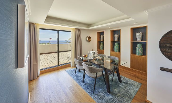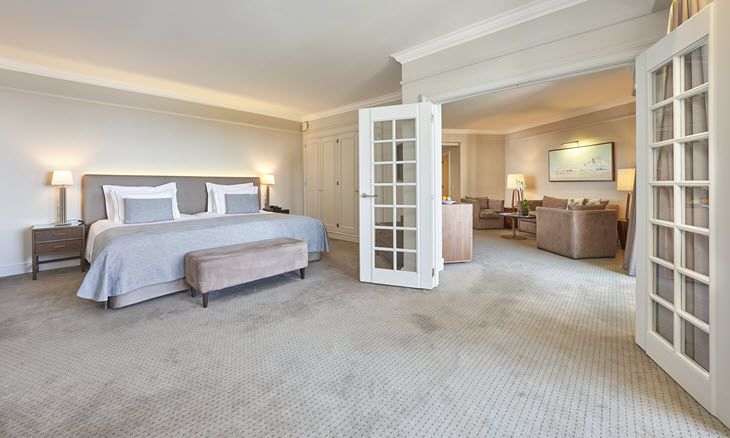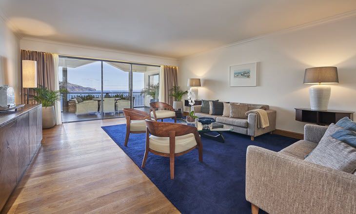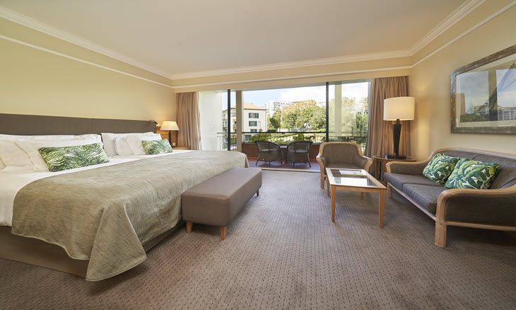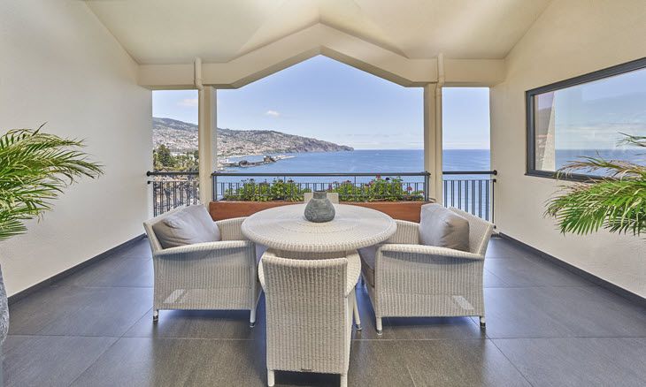 Large private balcony with furniture. View over the entrance gardens of the hotel and mountains or sea view. The Junior Suites are equipped with individually controlled air conditioning and heating, two satellite TV’s, minibar, direct dial telephone, tea & coffee making facilities and in room safe. Large entrance hall. Spacious marble bathroom with twin washbasins, separate bath and shower, scale, hairdryer and make-up mirror. Bedroom with double queen size beds, separate seating area with sofa and arm chairs (within the bedroom). Large private balcony with furniture. Views over the Atlantic Ocean, Funchal bay and gardens of the hotel.