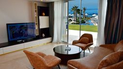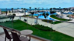 The hotel features 6 outdoor pools with sunbeds and parasols, along with a heated indoor pool at the spa centre. The property is located behind a sandy beach with clear water and draws an international surf crowd out of season. During summer the water is generally calm, making it suitable for swimming.